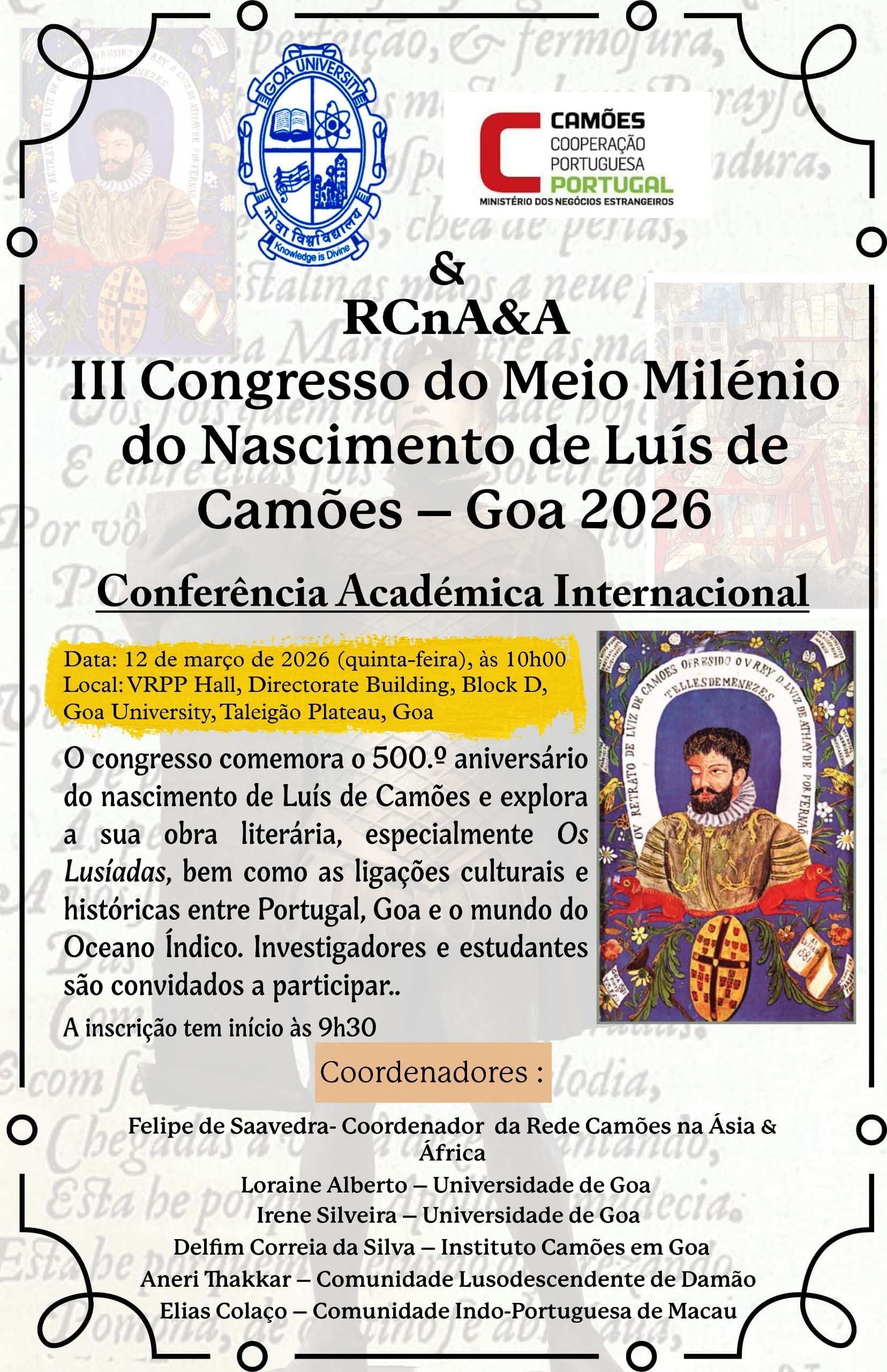 O III Congresso do Meio Milénio do Nascimento de Camões prossegue a série de reuniões científicas de alto perfil iniciadas em Ternate, Indonésia, em março de 2022, e prosseguidas em fevereiro de 2024 em Macau, e em junho de 2025 na Ilha de Moçambique, todos eles lugares de estadia prolongada do Poeta.